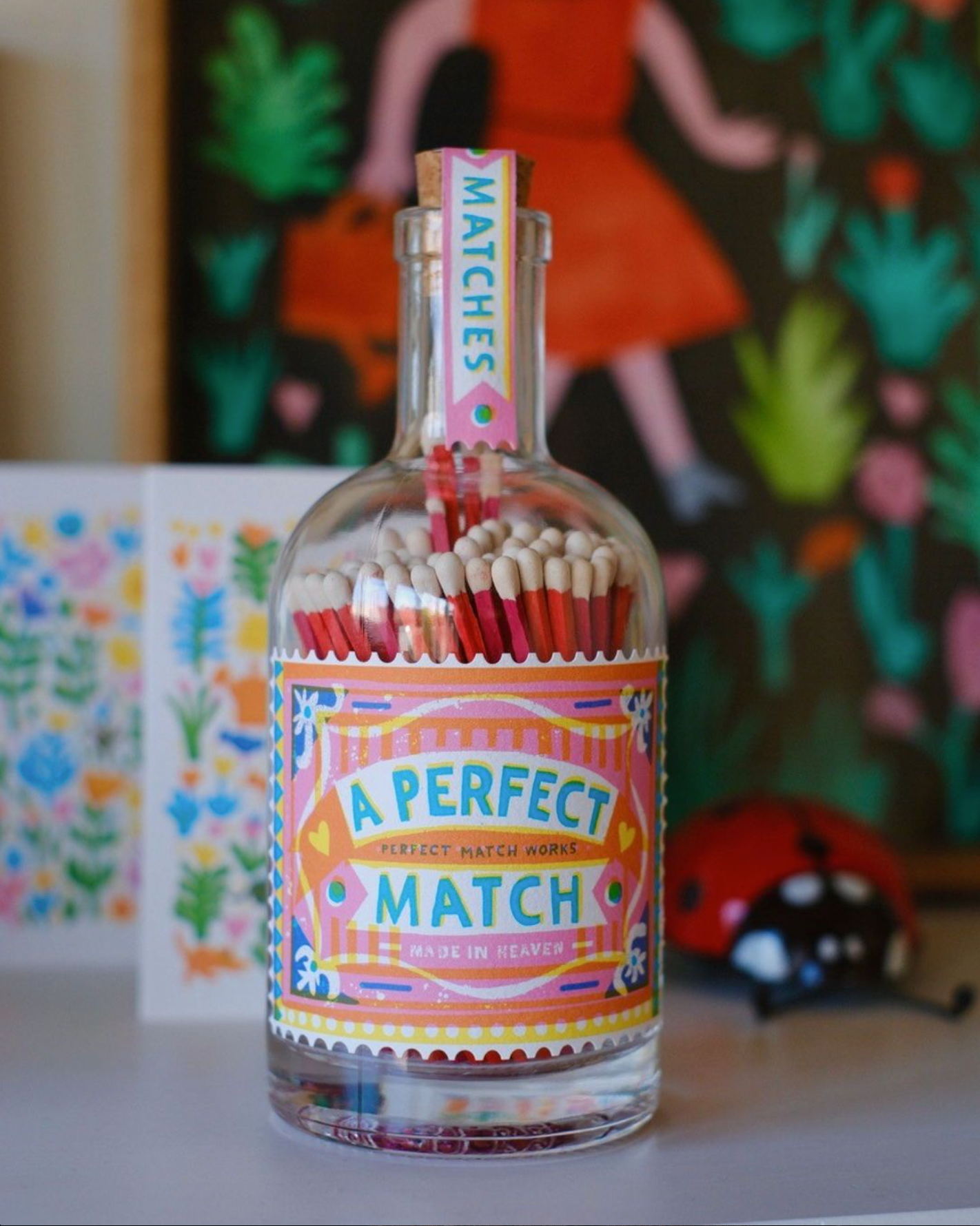 Breng kleur en stijl in je interieur met de Perfect Match Bottle, een limited edition luxe luciferfles geïmporteerd uit het Verenigd Koninkrijk. Ontworpen door de bekende kunstenaar The Printed Peanut, barst elke fles van vrolijke kleuren en elegantie. De fles bevat 125 handgeverfde roze en oranje lucifers met een helderwit tipje, verpakt in een slank en 100% recyclebaar glazen flesje.