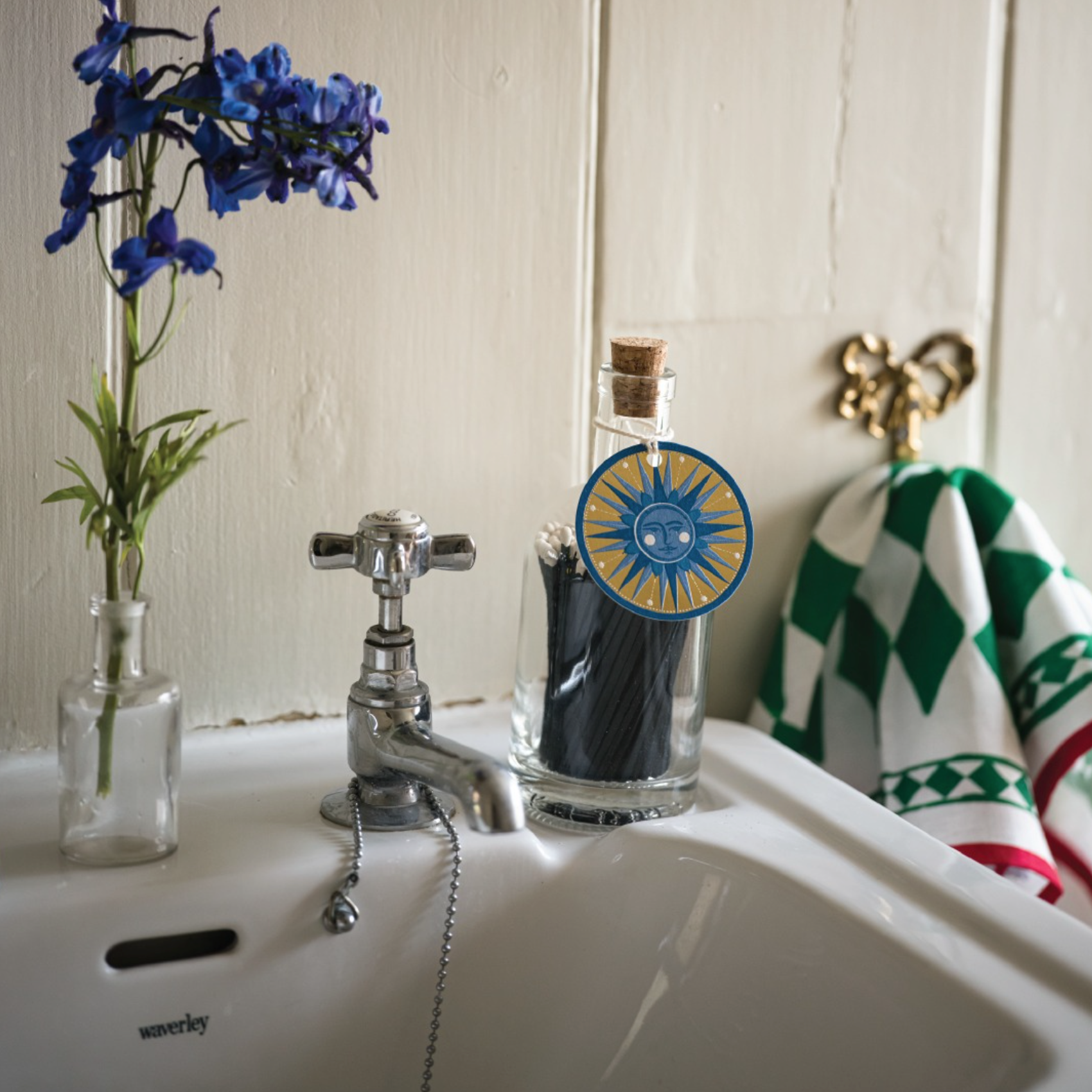 Breng een speelse en elegante sfeer in huis met deze lucifers. In het slanke glazen flesje vind je 125 handgeverfde blauwe lucifers, vergezeld van een stijlvol Golden Sun kaartje.