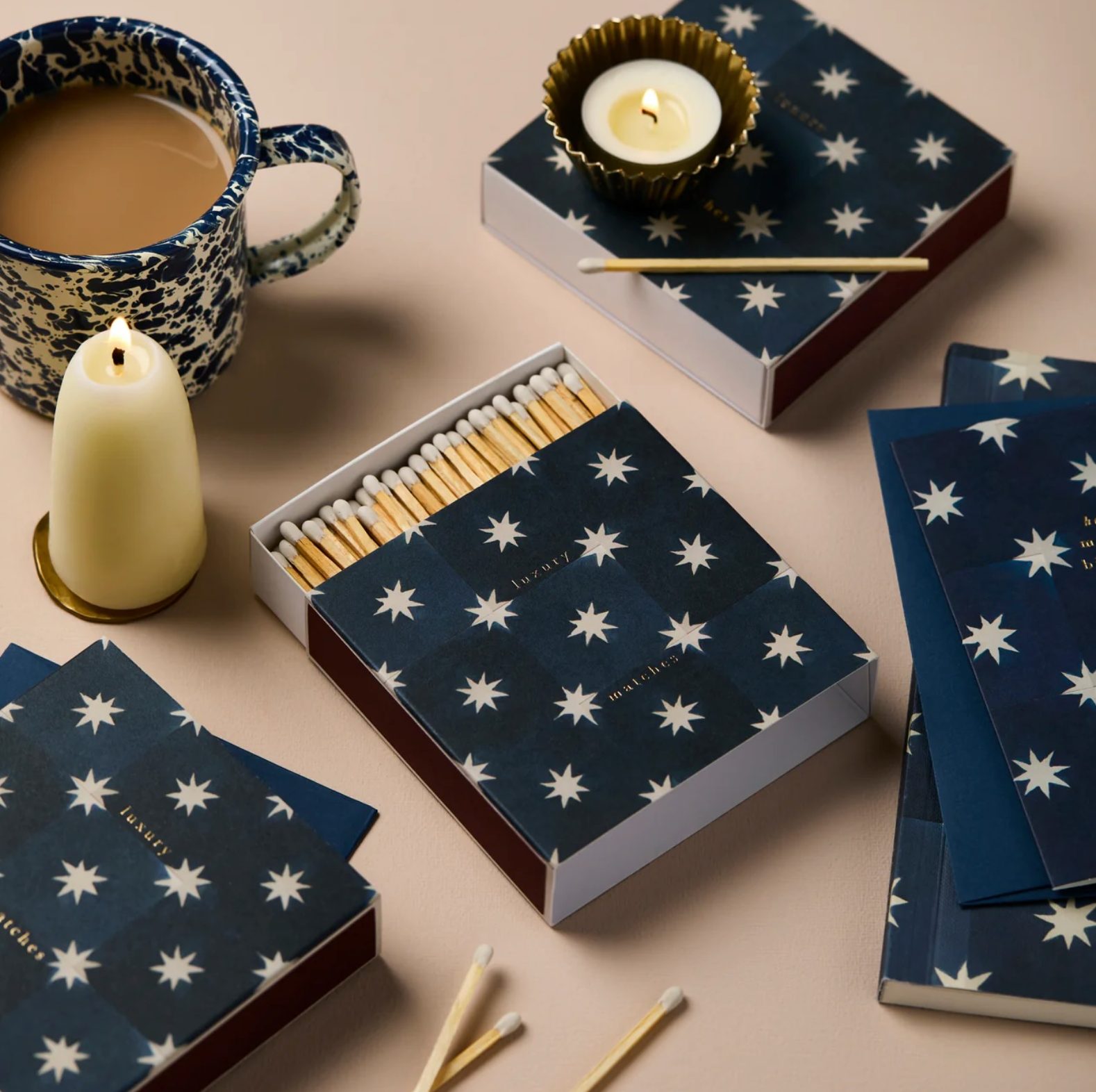 De Navy Star lucifers van Archivist Gallery zijn ontworpen in samenwerking met Wanderlust Paper Co. Het sterren patroon geeft een frisse, stijlvolle uitstraling en maakt deze lucifers net zo leuk om te zien als om te gebruiken. Ze zijn daardoor niet alleen praktisch, maar ook een mooi decoratief detail in huis.